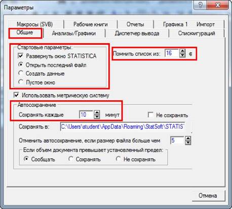 ("Загальні") вікна "Параметры".