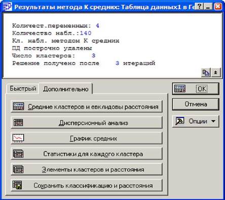 Верхня частина вікна результатів містить зведені дані для аналізу, а також інформацію відносно того, після скількох ітерацій побудовані кластери.