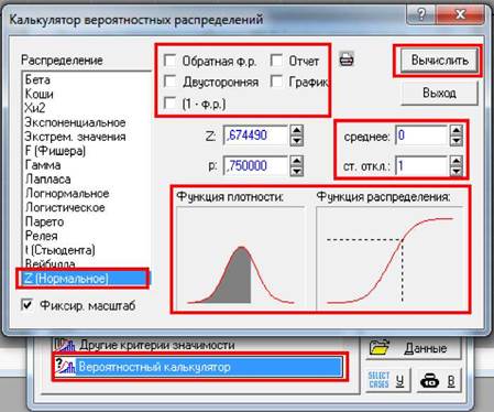 • Завантажити модуль "Основные статистики и таблицы" ("Bases Statistics/Tables"), вибрати у вікні "Основные статистики и таблицы" ("Basic Statistics and Tables:") пункт "Вероятностный калькулятор" ("Probability Calculator", імовірнісний калькулятор) і натиснути «ОК».
