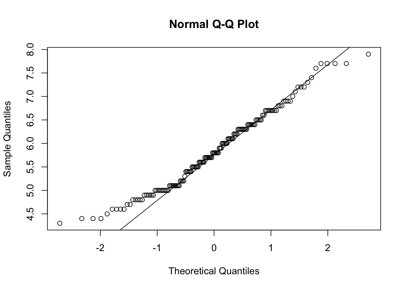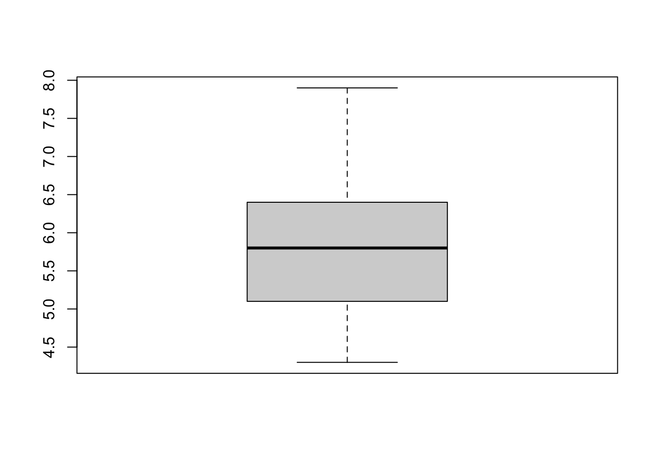 ## Sepal.Length 1 50 6.59 0.64 6.50 6.57 0.59 4.9 7.9 3.0 0.11 -0.20
